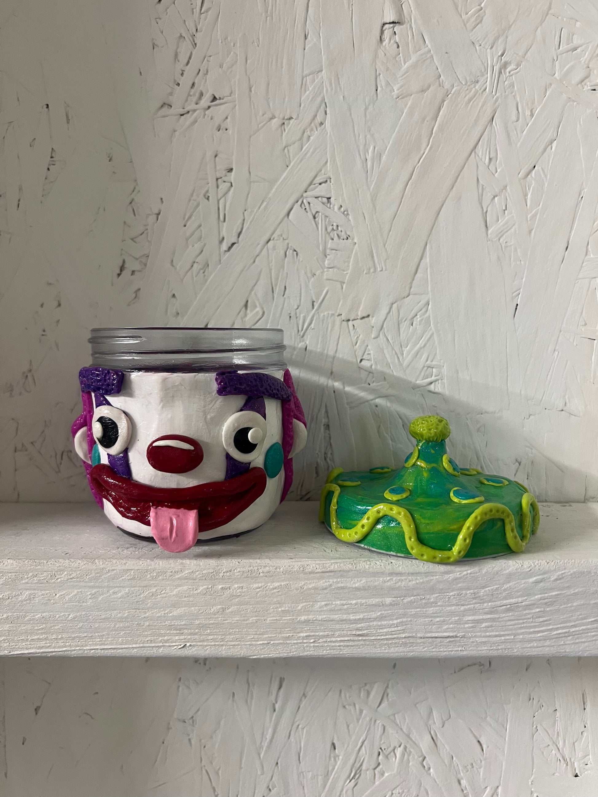 one of a kind handmade clay covered jar clowns made with love